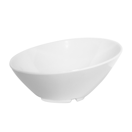 Bowl inclinado de 24 oz en melamina color blanco, diseñado para realzar presentaciones gourmet de sopas, pastas, ensaladas, poké bowls y más. Su diseño moderno, inclinado aporta dinamismo y estilo a la mesa, ideal para uso profesional y en el hogar..
