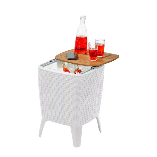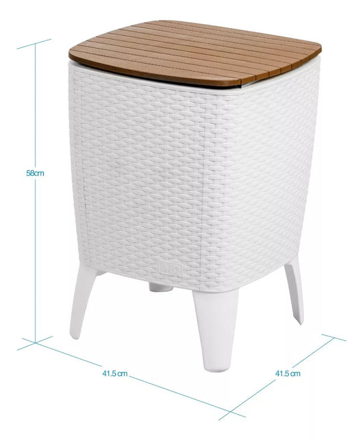 - Mesa Hielera, Producto fabricado en resina de polipropileno con protección UV, resistente y duradero a la intemperie, textura superior tipo madera y textura lateral tipo rattan. Su tapa tiene una capacidad de carga de 2,5 kilos y está diseñada con rieles de aluminio los cuales permiten un buen deslizamiento, su cubo interior tiene una capacidad de 28 litros (requiere hielo).