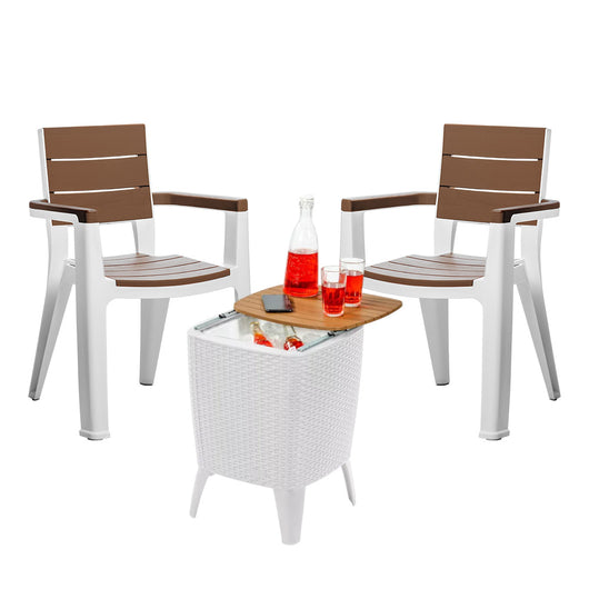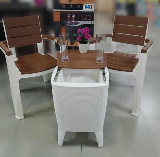 El combo incluye dos cómodas sillas con un diseño que simula la madera en tono caramelo, y una innovadora mesa hielera, ideal para mantener tus bebidas frías y al alcance de la mano. Fabricado con materiales resistentes a la intemperie, este set está diseñado para soportar las condiciones exteriores, garantizando durabilidad y fácil mantenimiento.