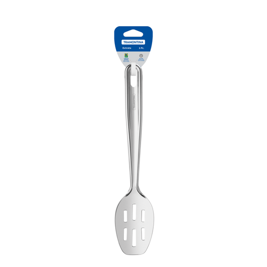 Cuchara perforada tramontina extrata en acero inoxidable con acabado brillante, ideal para servir y escurrir arroz u otros alimentos con facilidad. Combina resistencia, diseño elegante y practicidad, siendo perfecta para uso doméstico o profesional. Su mango con orificio permite colgarla para decorar y mantener el orden en la cocina.