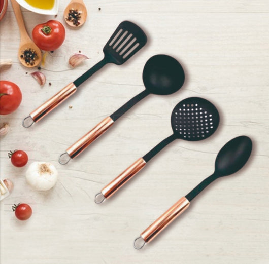 Ideal para cuidar tus ollas y sartenes con antiadherente. Nylon fuerte y flexible, no absorbe colores, ni sabores. Acabado cobre en el mango. Incluye aro colgador.
