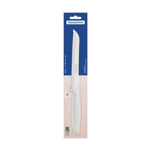 Cuchillo tramontina plenus de 7 pulgadas, diseñado especialmente para cortar pan sin aplastarlo. Su hoja dentada en acero inoxidable ofrece un corte preciso, mientras que su mango de polipropileno off white brinda comodidad y control en cada uso. Ideal para panes frescos, bollería y cortezas crujientes.