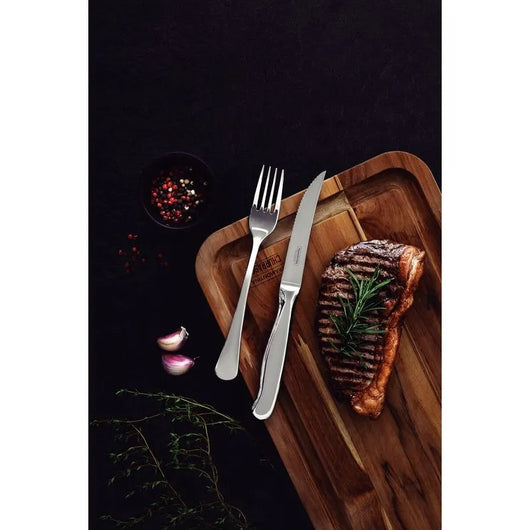 Cuchillo para asado tramontina cannes, diseñado especialmente para los amantes de la carne. Su hoja dentada en acero inoxidable templado ofrece un corte eficaz, mayor durabilidad del filo y resistencia a la corrosión. Su diseño elegante en alto brillo y mango ergonómico lo convierten en una pieza sofisticada para la mesa.