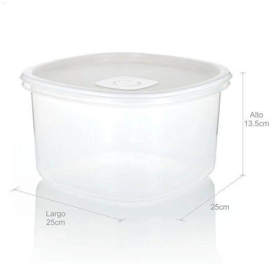 La tapa blanca de cierre ajustado incluye una guía central que asegura una hermeticidad confiable, conservando la frescura de tus alimentos por más tiempo. Además, este recipiente es libre de bpa, apto para microondas (con tapa superpuesta) y refrigeración, lo que lo convierte en una solución práctica para el día a día.