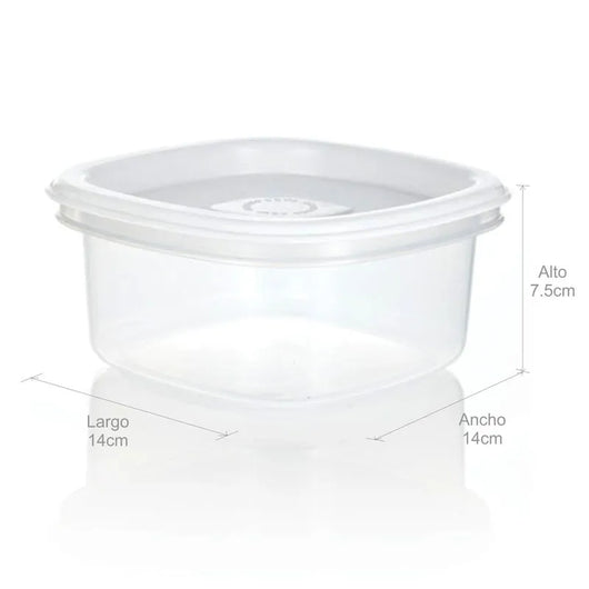 La tapa blanca de cierre ajustado incluye una guía central que asegura una hermeticidad confiable, conservando la frescura de tus alimentos por más tiempo. Además, este recipiente es libre de bpa, apto para microondas (con tapa superpuesta) y refrigeración, lo que lo convierte en una solución práctica para el día a día.