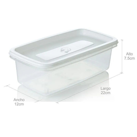 La tapa blanca de cierre ajustado incluye una guía central que asegura una hermeticidad confiable, conservando la frescura de tus alimentos por más tiempo. Además, este recipiente es libre de bpa, apto para microondas (con tapa superpuesta) y refrigeración, lo que lo convierte en una solución práctica para el día a día.