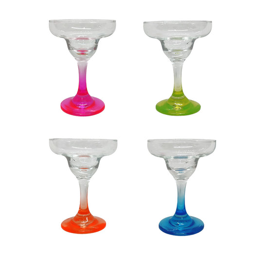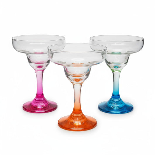 Con bases en tonos vibrantes, estas copas son ideales para margaritas, cócteles tropicales o para darle un toque divertido a cualquier reunión.