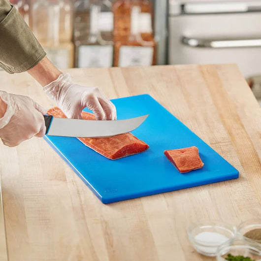 La tabla azul está especialmente diseñada para el corte y manipulación de pescados y mariscos crudos, manteniendo un control higiénico en la cocina.