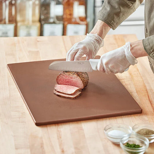 La tabla café se utiliza para el corte de carnes cocidas o alimentos ya preparados, ayudando a mantener la seguridad alimentaria en el servicio.