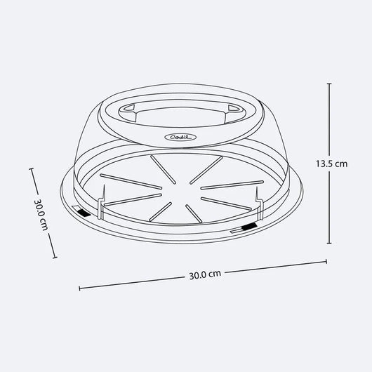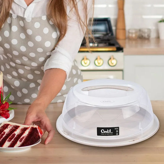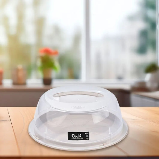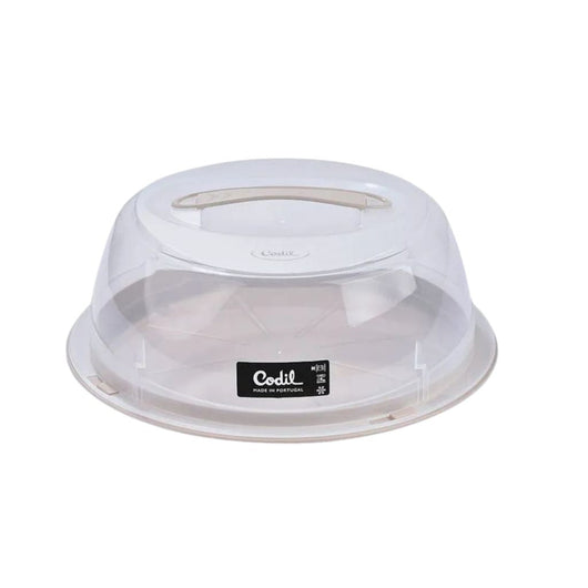 Mantén tus postres frescos y protegidos con la tortera taupe codil, ideal para almacenar, transportar y exhibir tortas, postres o pasteles húmedos. Su base reversible con bordes altos evita derrames y permite un uso versátil, ya sea para servir o conservar.
