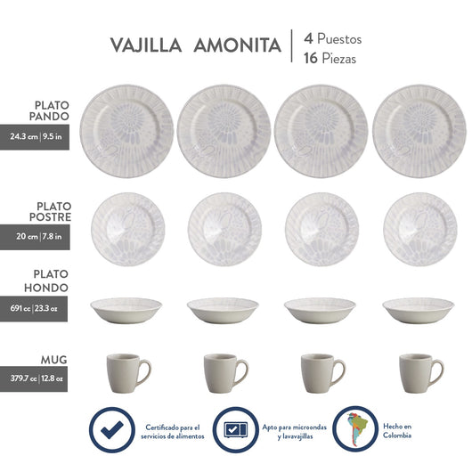 Vajilla Amonita 4 Puestos 16 Piezas / Corona