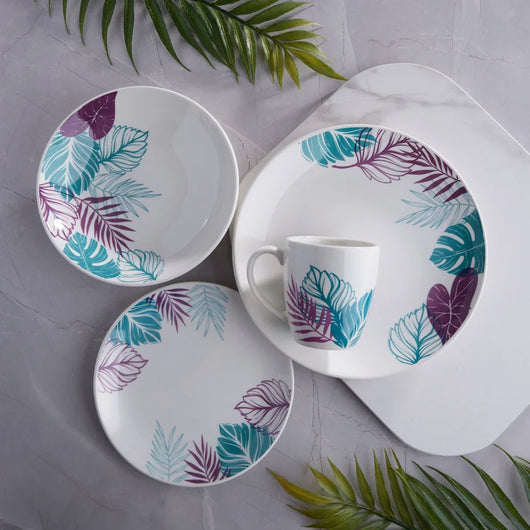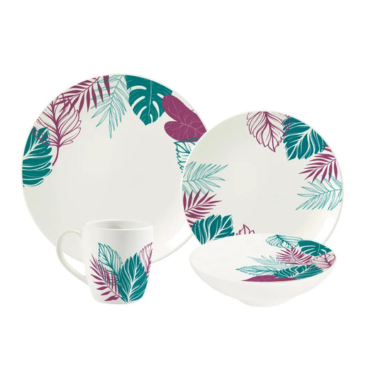 La Vajilla Greta de Corona es un estallido de energía y estilo que transforma tu mesa con un diseño vibrante y moderno. Inspirada en la naturaleza tropical, esta vajilla destaca por sus intensos patrones de hojas y palmas en tonos turquesa, verde y morado, inyectando frescura y alegría a cada comida.